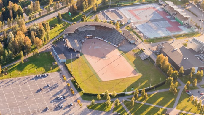 Pesäpallostadion sijaitsee Ouluhallin ja jäähallin välissä