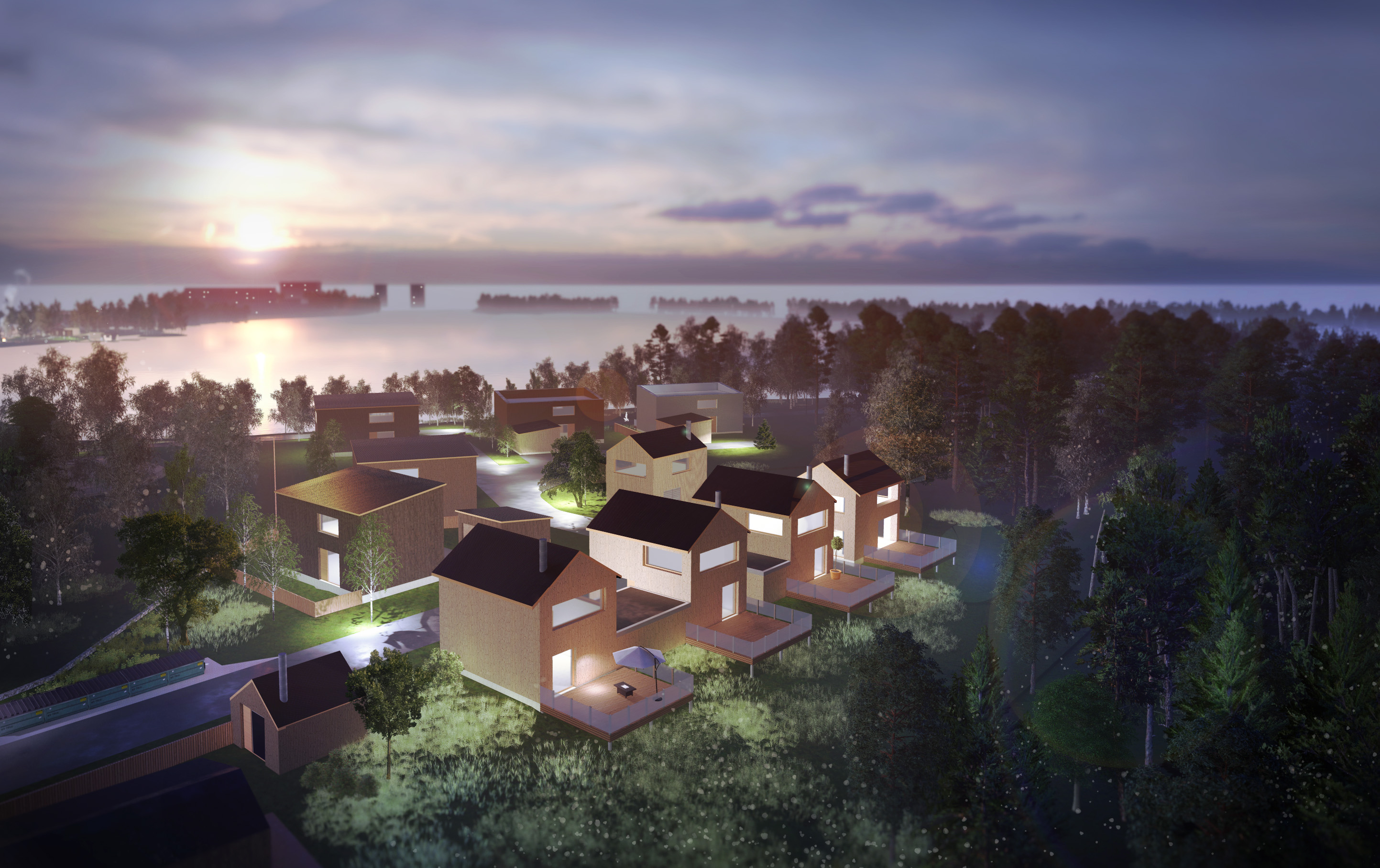 Havainnekuva Oulun asuntomessualueelle tulevista omakotitaloista.