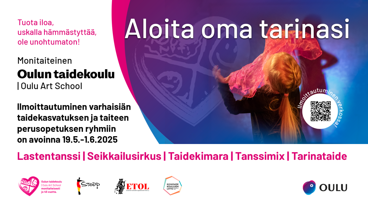 Lue lisää monitaiteisesta Oulun taidekoulusta ja tutustu taiteen perusopetukseen verkkosivuilla.