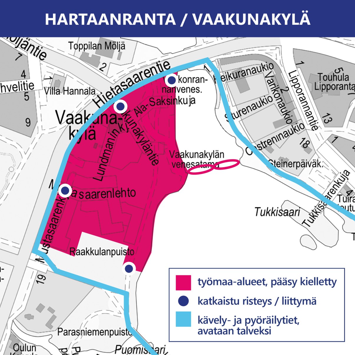Hietasaaren puoleinen Asuntomessualue Vaakunakylässä ja Lehtokylässä pysyy edelleen suljettuna työmaa-alueena. Kaikille avoin rantabulevardi valmistuu ensi kesäksi ja otetaan yhteiseen käyttöön Asuntomessutapahtuman jälkeen, syksyllä 2025. Myös Hartaansillan rakennustyöt jatkuvat kesän 2025 alkuun.