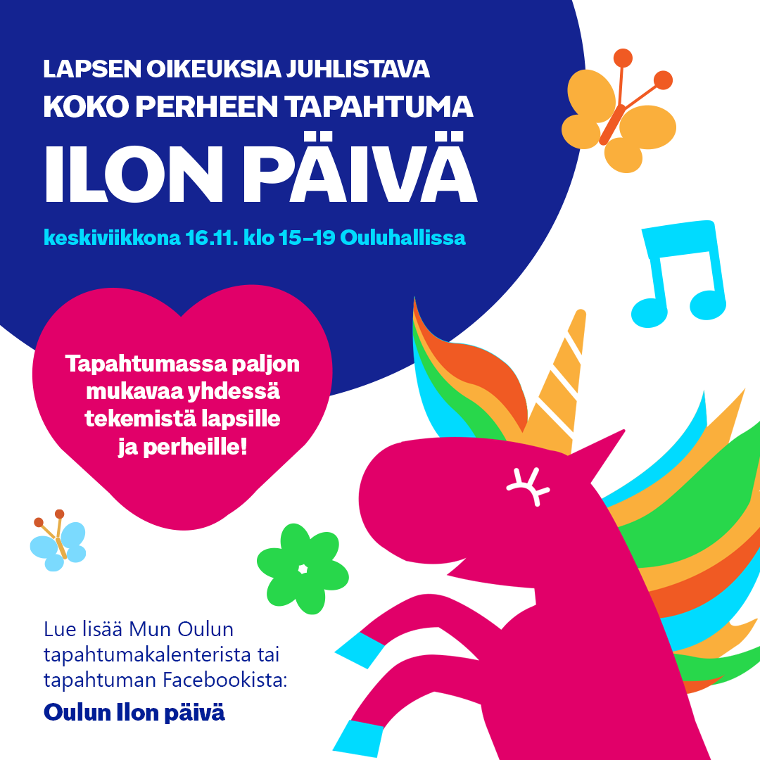 Ilon päivä -tapahtuma on lapsen oikeuksien viikon päätapahtuma Oulussa ja se juhlistaa lapsen oikeuksia. Katso kaikki Lapsen oikeuksien viikon tapahtumat Oulussa.