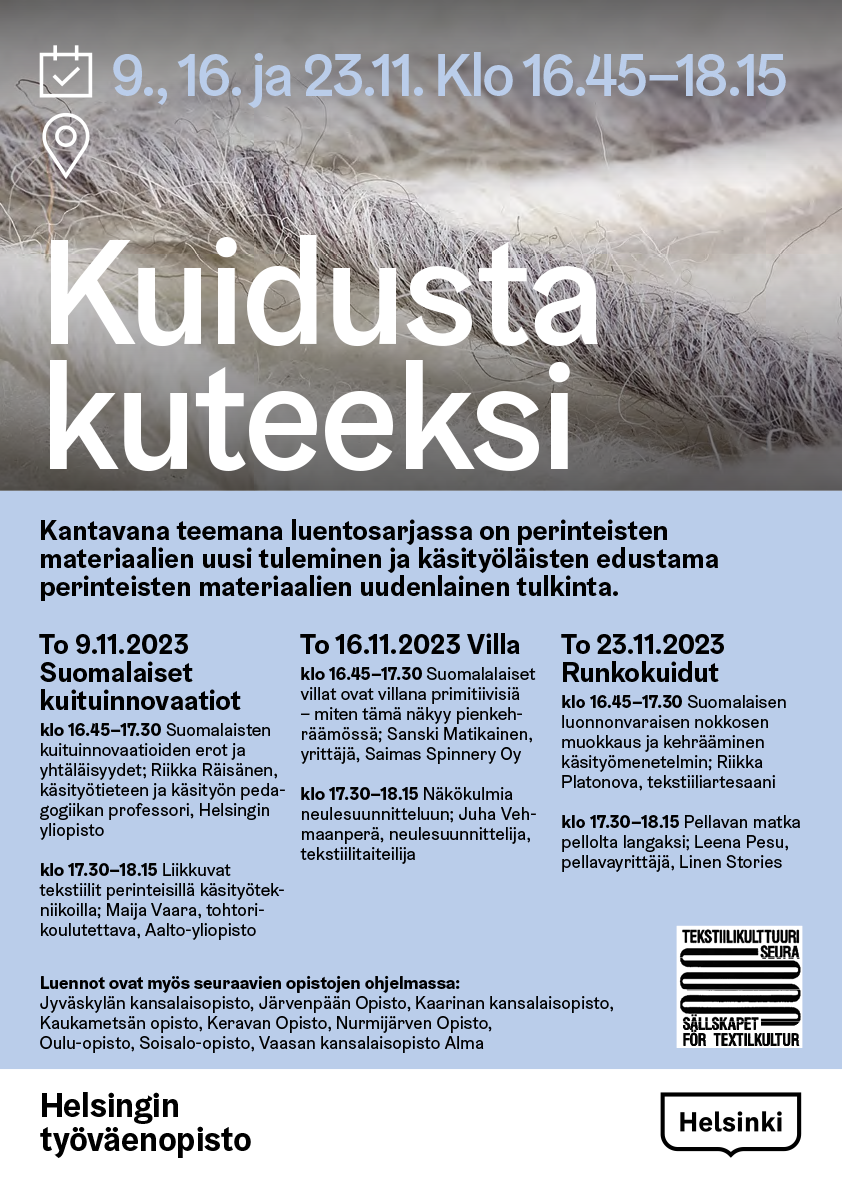 - klo 16.45–17.30 Suomalaiset kuituinnovaatiot Suomalaisten kuituinnovaatioiden erot ja yhtäläisyydet; Riikka Räisänen, käsityötieteen ja käsityön pedagogiikan professori, Helsingin yliopisto