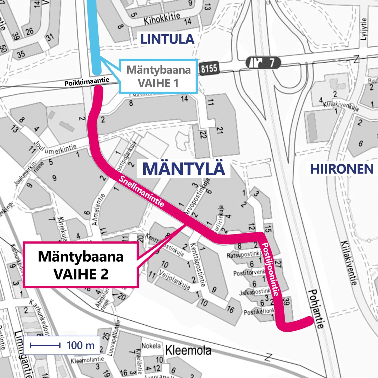 Mäntybaanan toiseen vaiheeseen kuuluvat Snellmanintien ja Postiljoonintien suuntainen pyöräliikenteen pääreitti sekä sitä sivuavat kadut. Liikenteellisenä tavoitteena on kävelijöiden ja pyöräilijöiden erottelu omille väylänosilleen ja liikkumisen sujuvoittaminen ja turvaaminen.