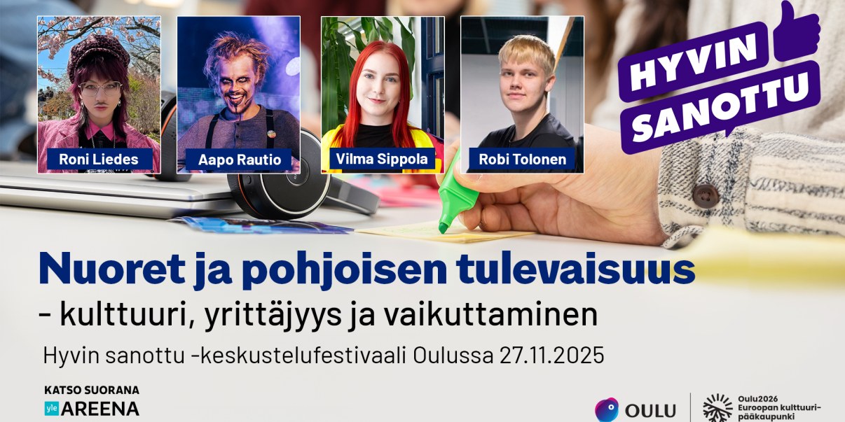Nuoret ja Pohjoisen tulevaisuus – kulttuuri, yrittäjyys ja vaikuttaminen -keskustelutilaisuus järjestetään Oulun kaupungintalon juhlasalissa to 27.11.2025 kello 17.00. Tapahtuma striimataan Yle Areenaan klo 17–17.50. Striimin voi katsoa Yle Areenasta: Nuoret ja Pohjoisen tulevaisuus - kulttuuri, yrittäjyys ja vaikuttaminen | Hyvin sanottu | Yle Areena