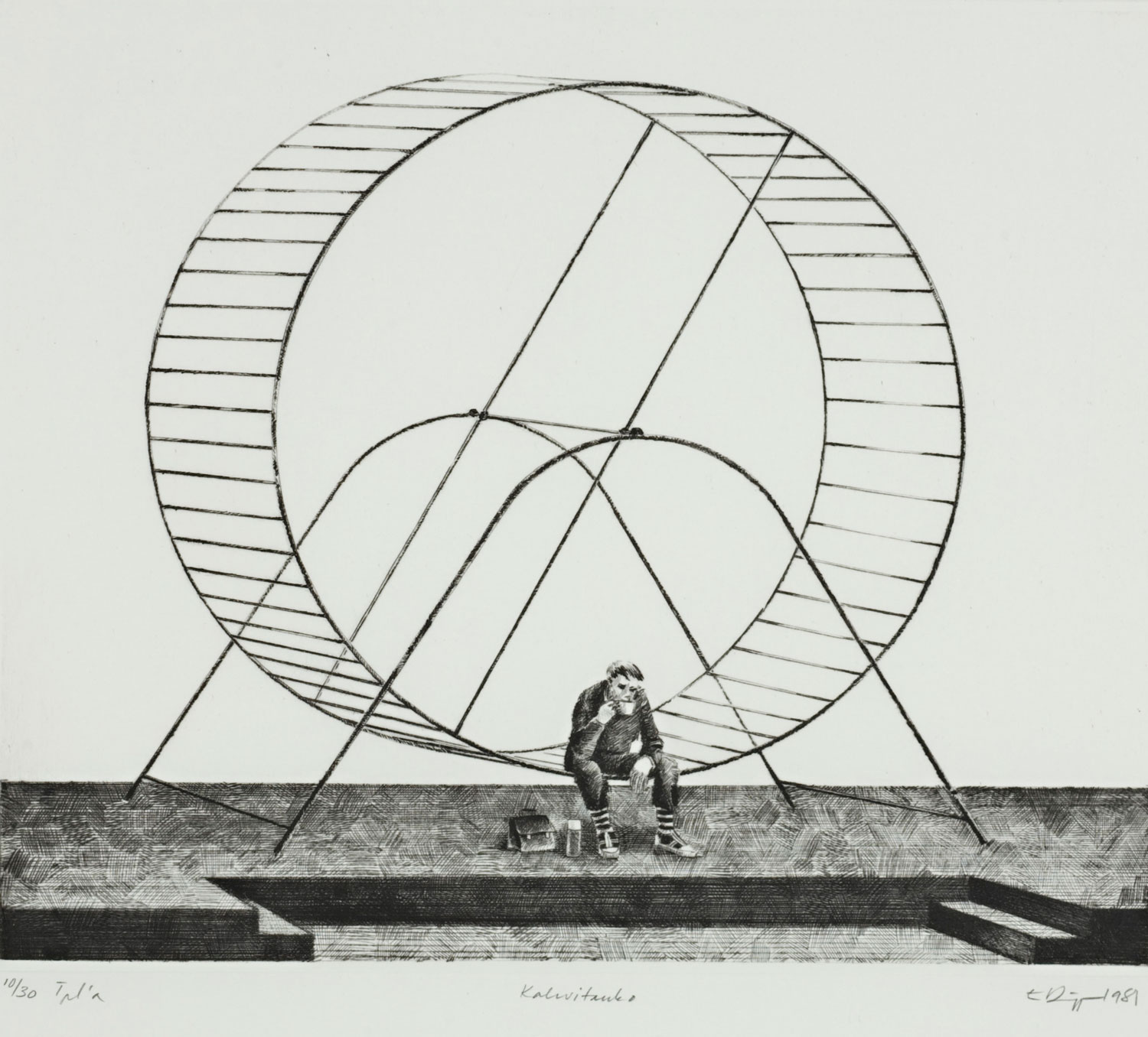 Kahvia – teetä? kysytään oululaisen Kari Tervon varhaistuotannon värigrafiikassa, jossa Arabian Myrna-kupin silhuetti piirtyy värikästä taustaa vasten odottamaan vastausta. Esa Riipan mustavalkoisessa kuivaneulatyössä työmies on kaivanut termospullon laukustaan ja istahtanut jättimäisen oravanpyörän reunalle viettämään Kahvitaukoa. Toisaalla Seija Guttormsen-Pajusen Lepotauko -teoksessa hahmot ovat keskittyneet sanomalehtiinsä. Ehkä he odottavat pöytään tarjoilua.