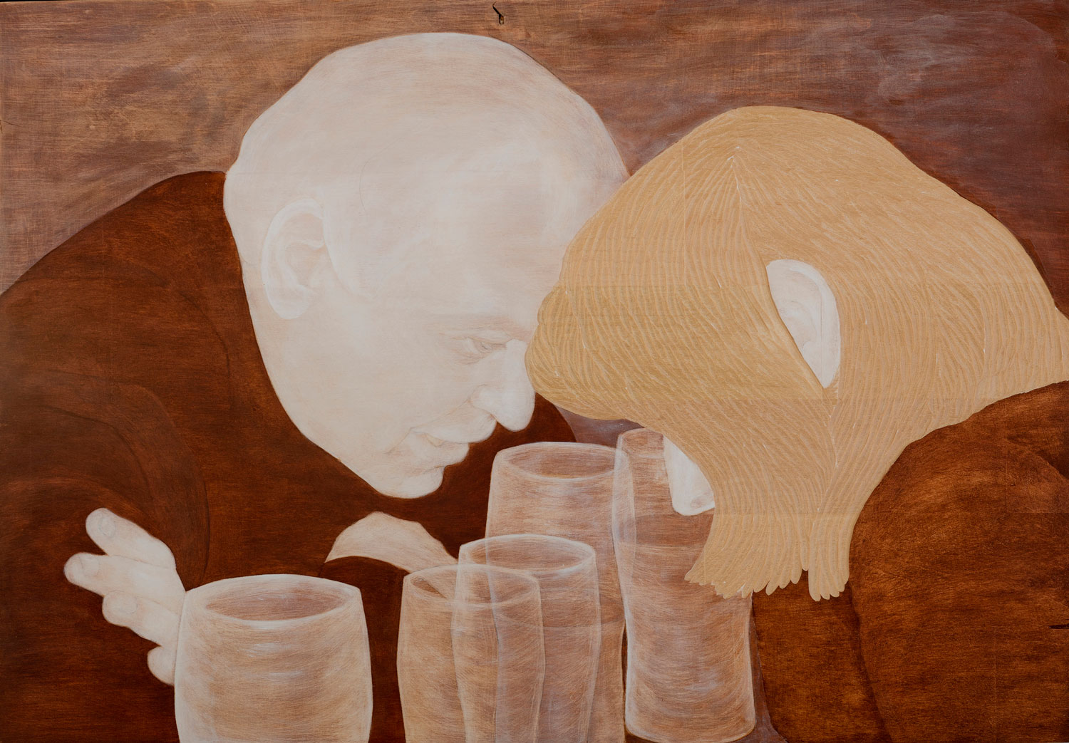 Kuvat: Esa Riippa: Kahvitauko, 1981, kuivaneula paperille. Hanna Vahvaselkä: Holiday Inn, 2008, öljyväri gesso koivuliimalevylle.