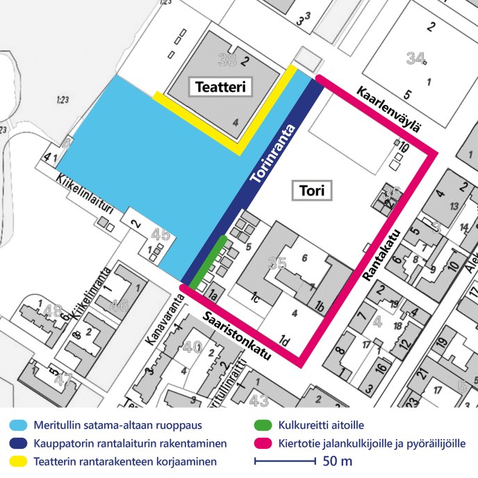 Yhtä aikaa torin töiden kanssa käynnistyy myös torinrannan laiturin uusiminen Kiikelin sillan ja Kaarlenväylän sillan välillä. Laiturissa on runsaasti lahovaurioita ja se on paikoin kallistunut sekä painunut. Jos laitureita ei uusittaisi, pahiten vaurioituneet kohdat olisi jouduttu mahdollisesti laittamaan käyttökieltoon.