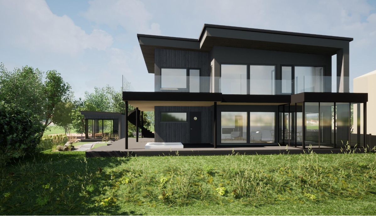 Veistoksellinen puutalo on arkkitehtonisesti korkealaatuinen ja yksi alueen esimerkkikohteista, joka mahdollistaa sähkön tuotannon ja kulutuksen ohjauksen monipuolisin digiratkaisuin. Havainnekuva: Arkkijussi Oy.