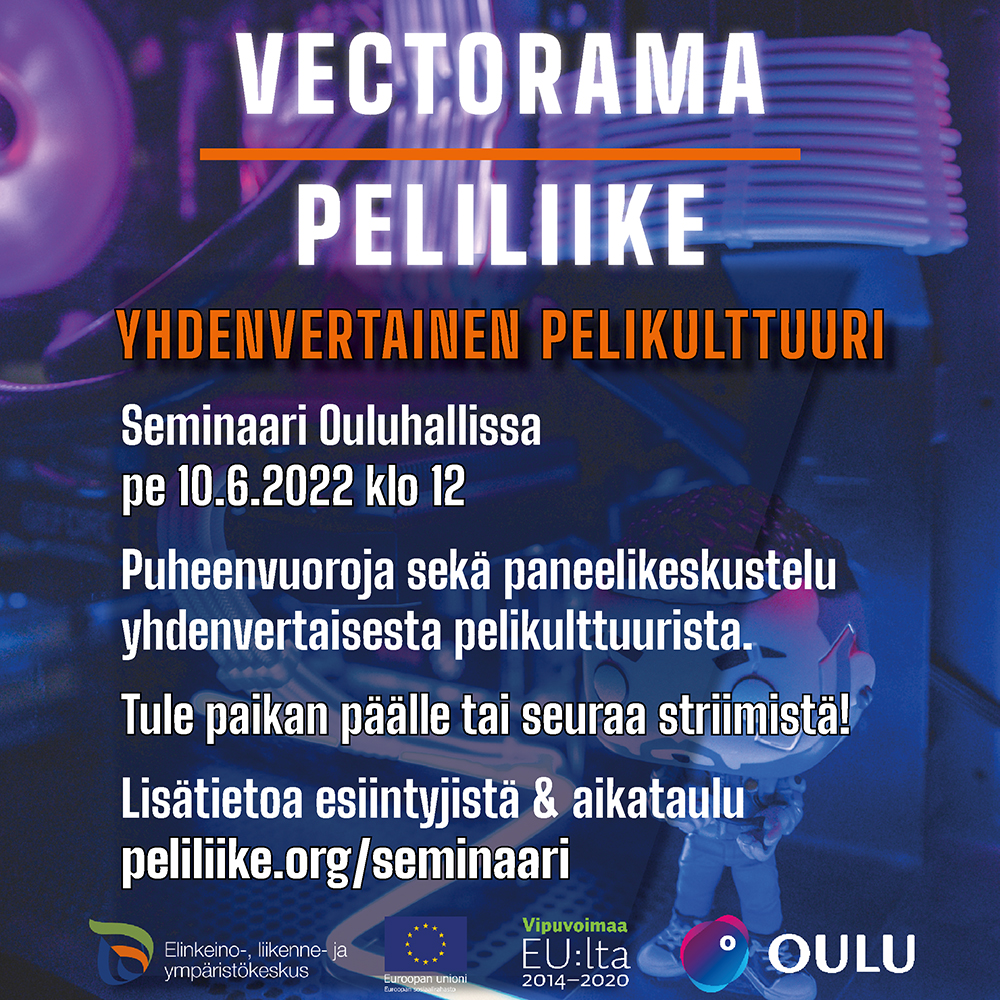 Peliliike ja Vector ry toteuttavat yhteistyössä seminaarin yhdenvertaisesta pelikulttuurista Vectorama-tapahtuman yhteydessä perjantaina 10.6. klo 12-18 Ouluhallissa.
