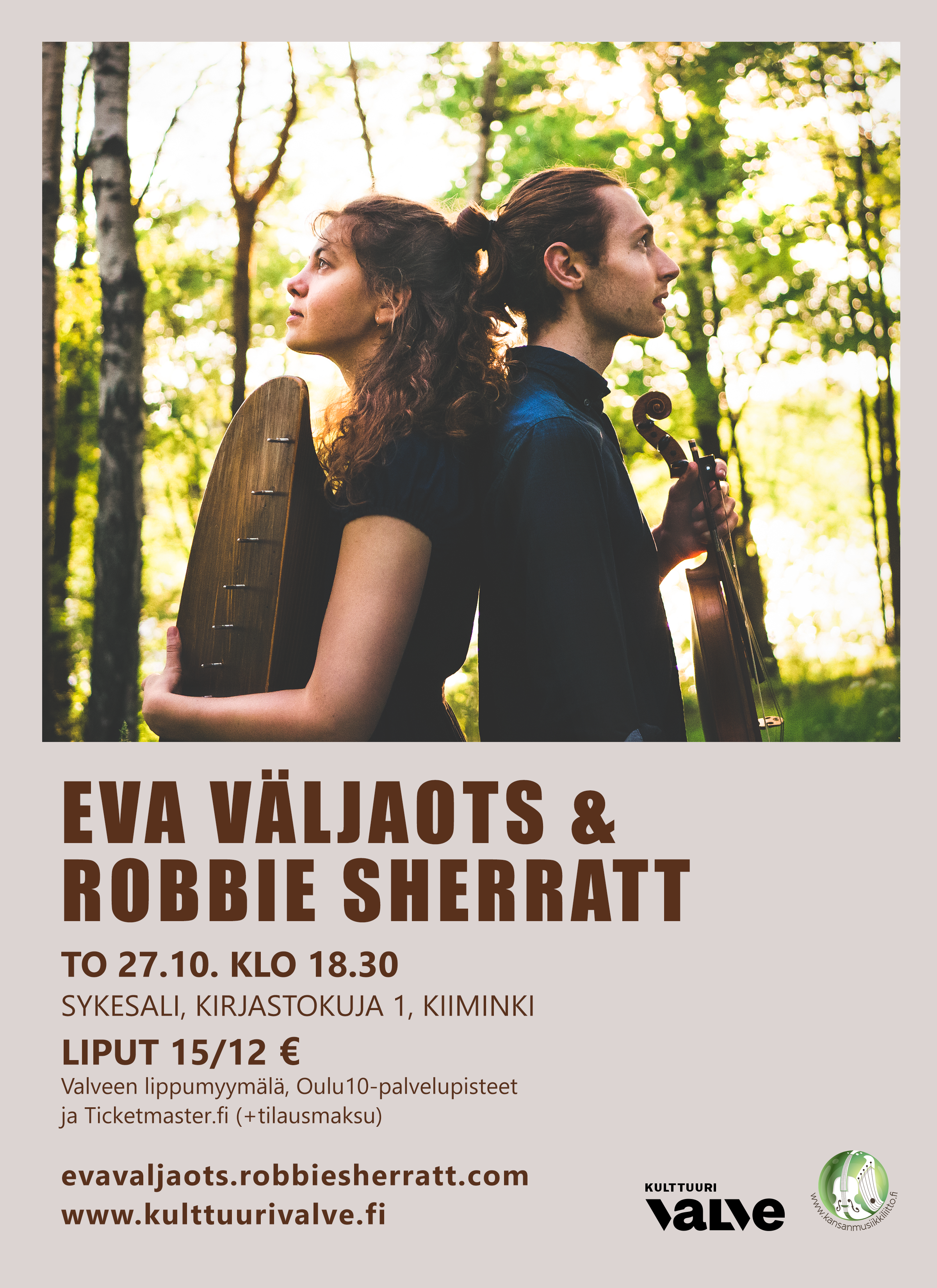 Suomen Kansanmusiikkiliiton lokakuun kiertueyhtye: Eva Väljaots & Robbie Sherratt torstaina 27.10. klo 18.30 Sykesalissa