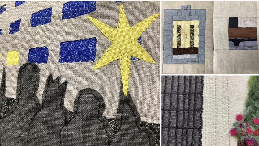 Rotuaarin varrella -haastetyössä on muun muassa Katriina Ruonion, Marita Pääskysen ja Helena Kalliosalon tilkkutöitä.