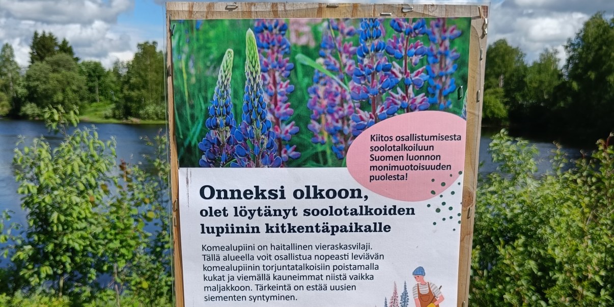 Soolotalkookohteissa torjutaan tänä vuonna jättipalsamia ja lupiinia. Mukava tapa torjua lupiinia on kerätä kukintoja maljakkoon ja hävittää ne sitten poltettavan sekajätteen mukana. Ohjeistusta löytyy viheralueiden kunnossapidon nettisivuilta.
