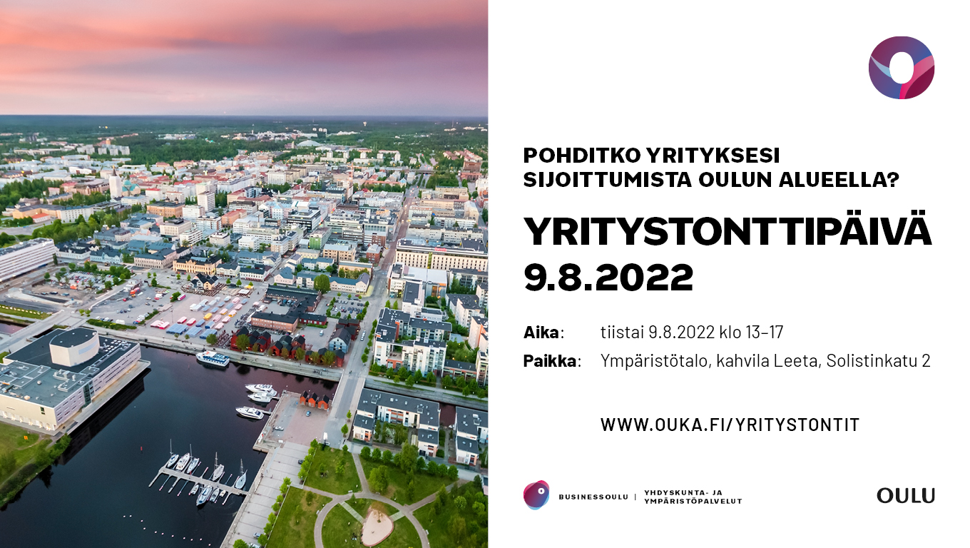 Tule tutustumaan Oulun kaupungin teollisuus-, toimisto- ja liiketilojen tonttitarjontaan sekä yritysalueisiin. Tapaat samalla kertaa tonttiasioiden, asemakaavoituksen ja BusinessOulun asiantuntijat.