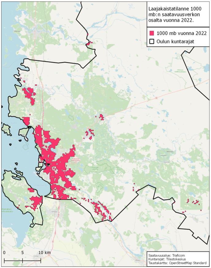 - 13% Oulun kotitalouksista sijaitsee punaisen alueen ulkopuolella. Toisaalta Oulun alueella sijaitsee myös runsaasti kesämökkejä erityisesti vesistöjen läheisyydessä. Mökkejä kunnassa on yhteensä 4200 (2021), jotka sijaitsevat pääasiassa saatavuusalueen ulkopuolella. Asuinrakennuksia saatavuusalueen ulkopuolella on 4861 kpl.