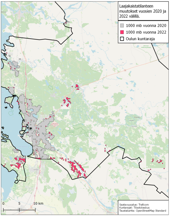 Laajakaistatilanteen muutokset -kartassa vertaillaan vuoden 2022 alun laajakaistan tilannetta vuoden 2020 alun tilanteeseen. Kahden vuoden aikana rakentuneet, ja aineiston keräyshetkellä valmiit alueet on merkitty karttaan punaisella.