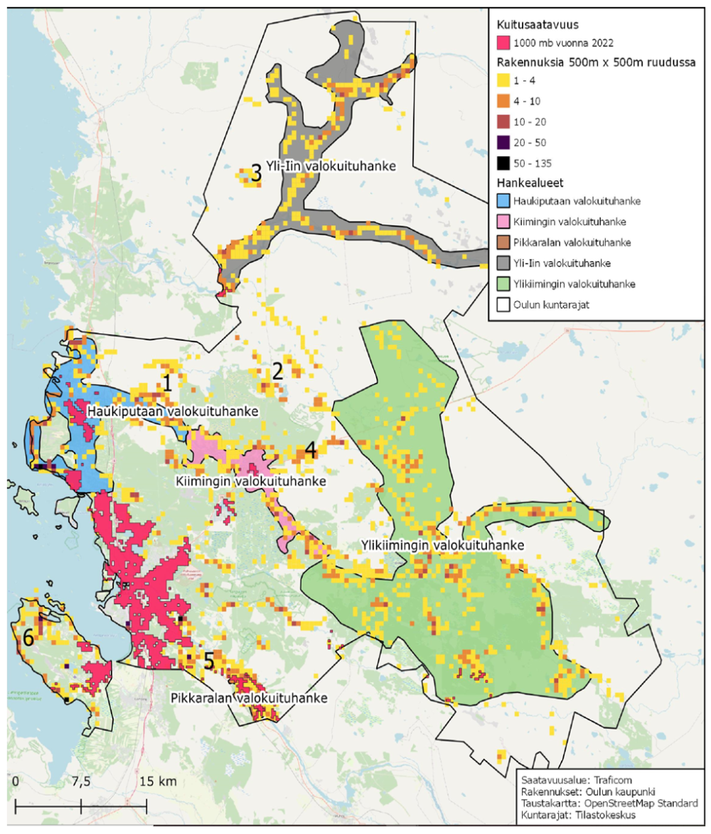 Hankealueiden ja kuitusaatavuusalueiden katvealueilla sijaitsee yhteensä noin 1800 kiinteistöä hajanaisesti eri puolilla. Korkein rakennustiheys katvealueista on Oulunsalon rannikkoalueilla, tien 20 varrella sekä Madekoskella.
