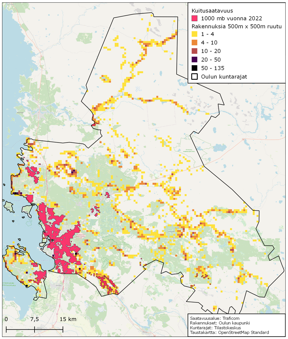 Kartassa on kuvattuna 1000 Mb/s kiinteän laajakaistan saatavuus Oulun kaupungin alueella sekä saatavuusalueiden ulkopuolella sijaitsevat asuin- ja vapaa-ajan rakennukset 500 m x 500 m pikseleinä.