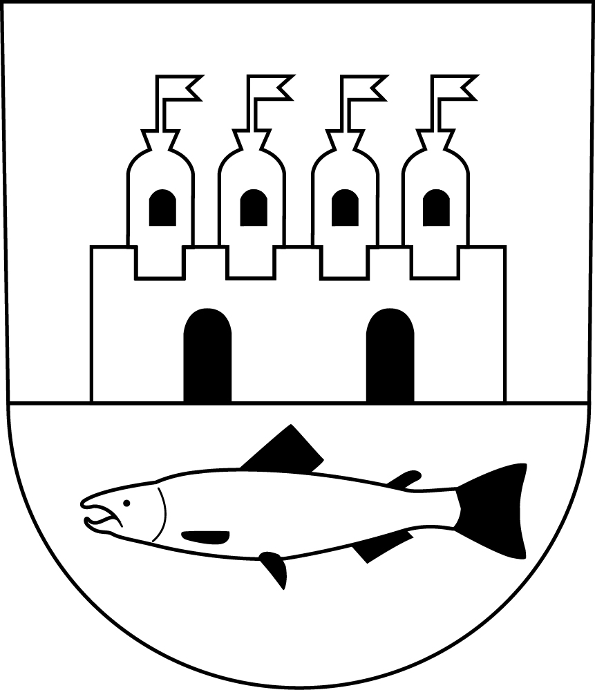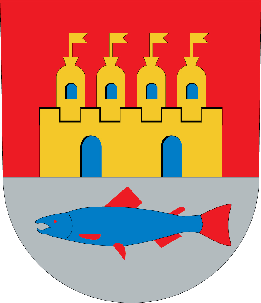 "Punaisessa kentässä hopeisesta tyviöstä nouseva kultainen, sinisin portti- ja ikkuna-aukoin varustettu linna, jossa neljä viirein koristettua kupukattoista tornia; tyviössä sininen, punavaruksinen lohi." (Kaupunginvaltuusto 24.11.1953)