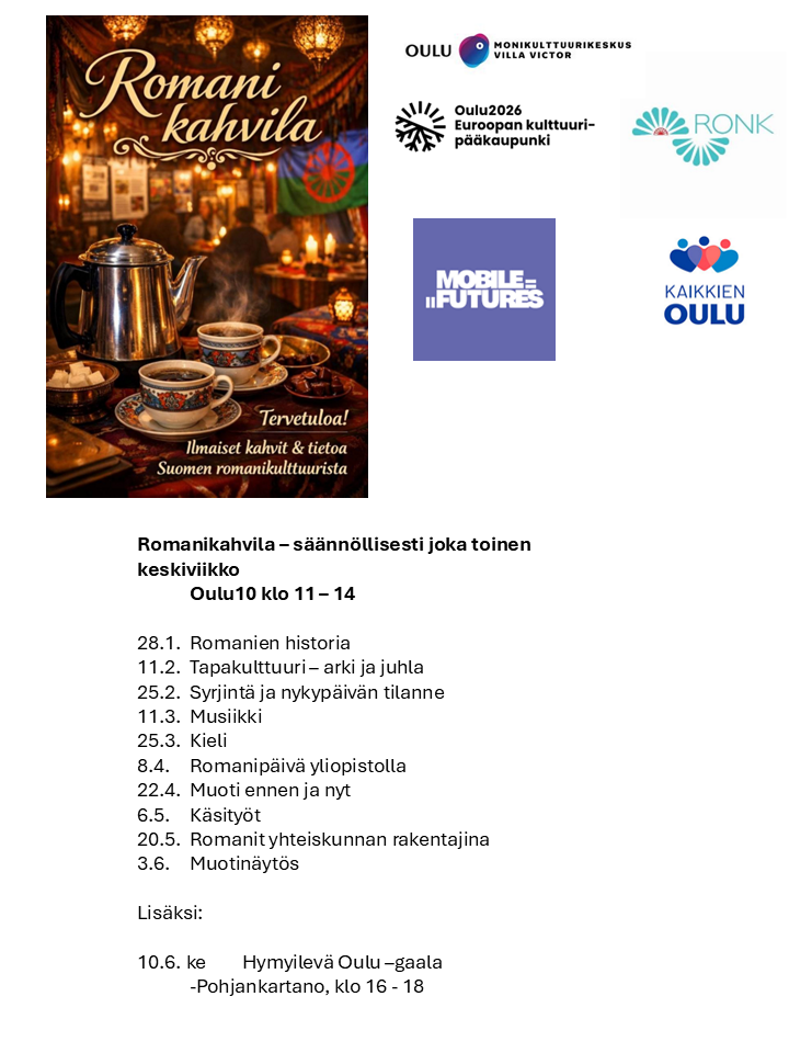 Romanikahvila kutsuu sinut jälleen kahville romanikulttuurin ääreen. Joka toinen keskiviikko 28.1. alkaen romanikahvila tarjoilee kahvit ja tietoa romaneista - heidän kulttuuristaan yleensä sekä siihen liittyvistä ilmiöistä. Kahvilan emännät ovat myös kertomassa ja vastaamassa kysymyksiin. Joka kerta on myös oma erikoisteemansa. Katso ohjelma tästä linkistä.