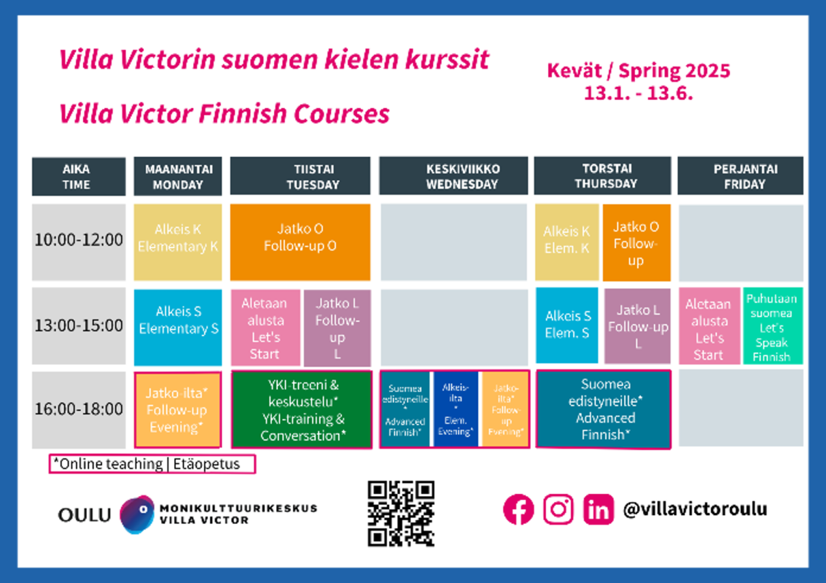 Villa Victorissa voit opiskella suomen kieltä lähiopetuksena sekä etäkursseilla. Kaikki kurssimme ovat maksuttomia.