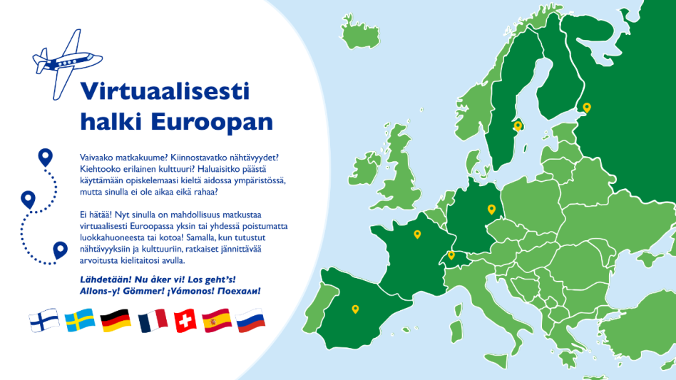 Ei hätää! Nyt sinulla on mahdollisuus matkustaa virtuaalisesti Euroopassa yksin tai yhdessä poistumatta luokkahuoneesta tai kotoa! Samalla, kun tutustut nähtävyyksiin ja kulttuuriin, ratkaiset jännittävää arvoitusta kielitaitosi avulla.