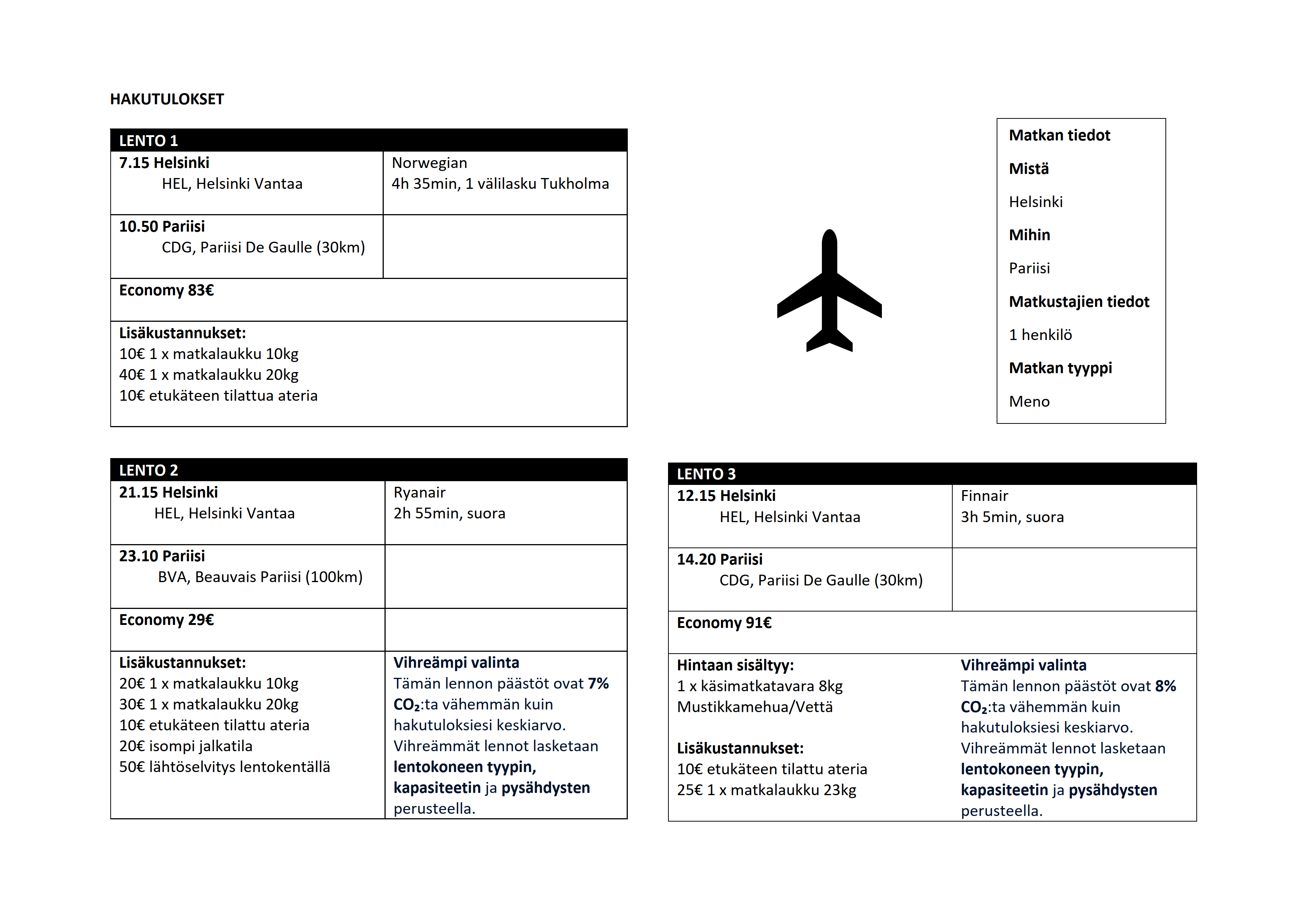 Ranska lennot Varaa lennot Tutki lentoja ja vastaa kysymyksiin. 1. Tutki hintoja. Et halua lennolle ateriaa, mutta haluat mukaan ison (20-23kg) matkalaukun. Mikä lennoista tulee sinulle halvimmaksi? 2. Tutki lentoaikoja. Ota huomioon välilaskut. Mikä lennoista on nopein? 3. Tutki lentojen lähtö-ja saapumisaikoja. Ota huomioon, että sinun tulee olla lentokentällä kaksi tuntia ennen lähtöä ja määränpäässä sinulta kuluu aikaa siirtyessäsi lentokentältä majoitukseen. Minkä lennon aikataulu olisi sopivin? 4. Tutki lentokenttiä. Pariisissa on useita lentokenttiä. Mikä lennoista vie sinut lähimmäs Pariisia? 5. Tutki lentojen päästöjä. Mikä lennoista on ympäristöystävällisin? 6. Minkä lennon valitsisit vertailujesi perusteella? Minkä lennon valitsisit vertailujesi perusteella? Varaa lento täyttämällä lomake alla olevan passin ja maksukortin tiedoilla. Prénom Nom de famille Numéro de téléphone E-mail-Adresse Numéro de carte de paiement Durée de validité de la carte de paiement Kiitos varauksestasi! Lennon varaustunnus on R2L2A8 (tallenna koodipassiin). Siirry tästä tutkimaan säätä ja pakkaamaan