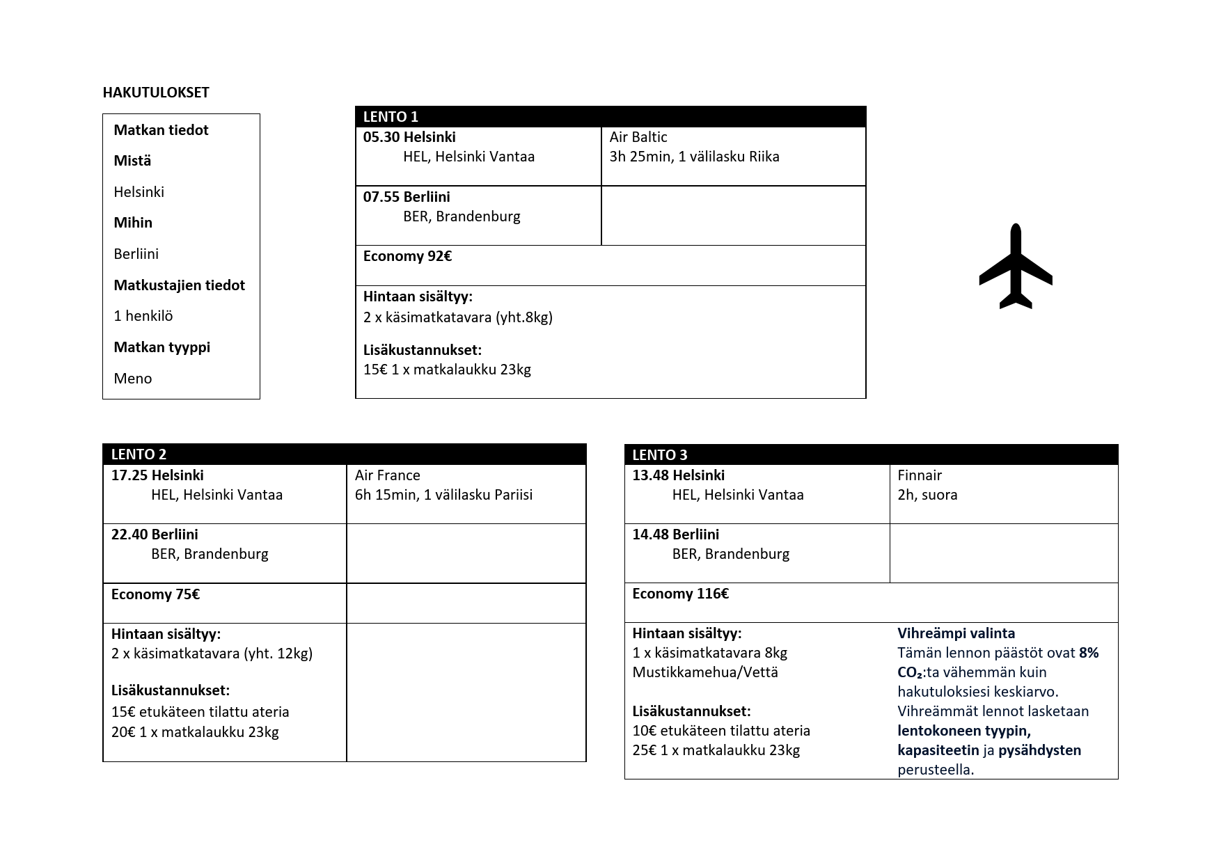 Saksa lennot Varaa lennot Suoria lentoja Leipzigiin ei juuri ole. Etsi siis lentoja Berliiniin, jonne on paljon enemmän vaihtoehtoja. Tutki lentoja ja vastaa kysymyksiin. 1. Tutki hintoja. Et halua lennolle ateriaa, mutta haluat mukaan 23kg matkalaukun. Mikä lennoista tulee sinulle halvimmaksi? (Syötä pelkkä lennon numero) 2. Tutki lentoaikoja. Ota huomioon välilaskut. Mikä lennoista on nopein? (Syötä pelkkä lennon numero) 3. Tutki lentojen lähtö-ja saapumisaikoja. Ota huomioon, että sinun tulee olla lentokentällä kaksi tuntia ennen lähtöä ja määränpäässä sinulta kuluu aikaa siirtyessäsi Berliinistä Leipzigiin. Minkä lennon aikataulu olisi sinulle sopivin? (Syötä pelkkä lennon numero) 4. Tutki lentojen päästöjä. Mikä lennoista on ympäristöystävällisin? (Syötä pelkkä lennon numero) 5. Minkä lennon valitsisit vertailujesi perusteella? (Syötä pelkkä lennon numero) Varaa lento täyttämällä lomake alla olevan passin ja maksukortin tiedoilla. Etunimi Sukunimi Puhelinnumero Sähköpostiosoite Maksukortin numero Maksukortin voimassaoloaika Kiitos varauksestasi! Lennon varaustunnus on R2L2A6 (tallenna koodipassiin). Siirry tästä pakkaamaan