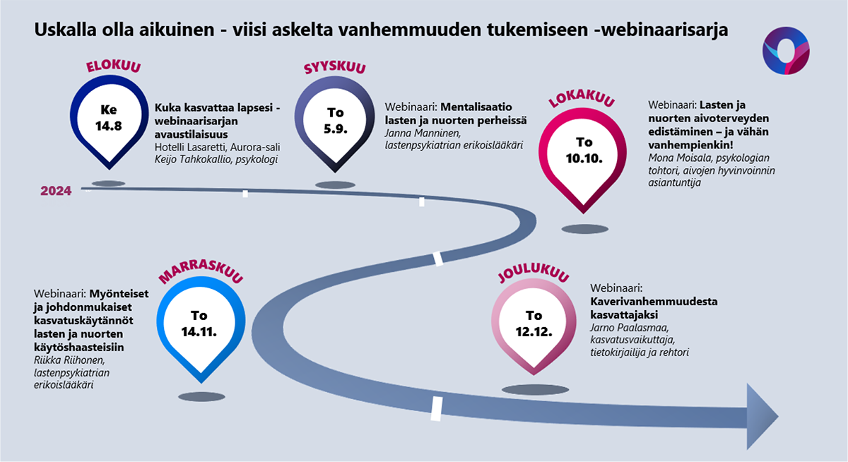 Uskalla olla aikuinen - viisi askelta vanhemmuuden tukemiseen -webinaarisarja kutsuu kaikenikäisten lasten vanhemmat sekä kasvatusalan toimijat yhteiseen oppimiskokemukseen kasvatuskulttuurin matkalle. Viisi eri alojen ammattilaista antaa tietoa ja vinkkejä tärkeistä kasvatusteemoista.