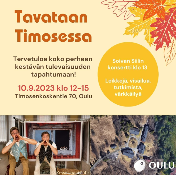 Perinteiset luontosunnuntait Timosenkoskella saavat uutta maustetta, kun Timosenkosken luontokoulu ja Heikinharjun luontokoto muuttavat Timoseen (ent. Timosenkoti). Tervetuloa koko perheellä avajaisiin Timoseen 10.9. klo 12-15: luvassa Soivan Siilin konsertti, kestävyysteemaisia toimintapisteitä ja syksyistä luontotunnelmaa! Tapahtuma on osa oululaista Kestävän tulevaisuuden opinvirtaa – toimintamallia ja verkostoa - johon jokainen voi tulla mukaan edistämään omalla tavallaan kestävää tulevaisuutta.